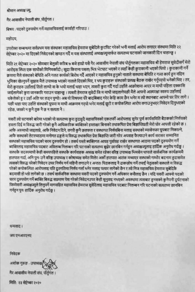 एन आर एन ए पोर्तुगलका उपाध्यक्ष अशोक गुरुङ्ले महासचिव हेमराज सुबेदिलाइ पदको दुरुपयोग गरेको आरोप लगाउदै कार्वाही गर्न माग गरेका छन । सस्थाको आधिकारिक फेसबुक ग्रुपमा नितान्त ब्यक्तिगत आग्रह र पुर्वाग्रहबाट प्रेरित भइ सस्थाका जिम्मेवार ब्यक्तिहरुलाइ आफुखुशी हटाउने र जोड्ने काम गरिरहेको, सस्थाको कुनै निर्णय र निर्देशनबिना आधिकारिक पेजमा ब्लक गर्ने गरेको भन्दै यसरी आफ्नो पदको दुरुपयोग गर्ने महासचिव हेमराज सुवेदीलाई अविलम्ब कार्वाही गर्न उपाध्यक्ष गुरुङ्ले माग गरेका छन ।