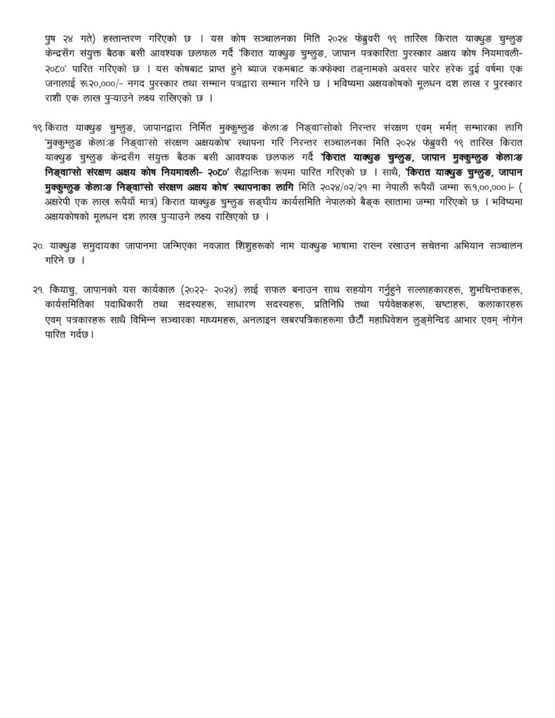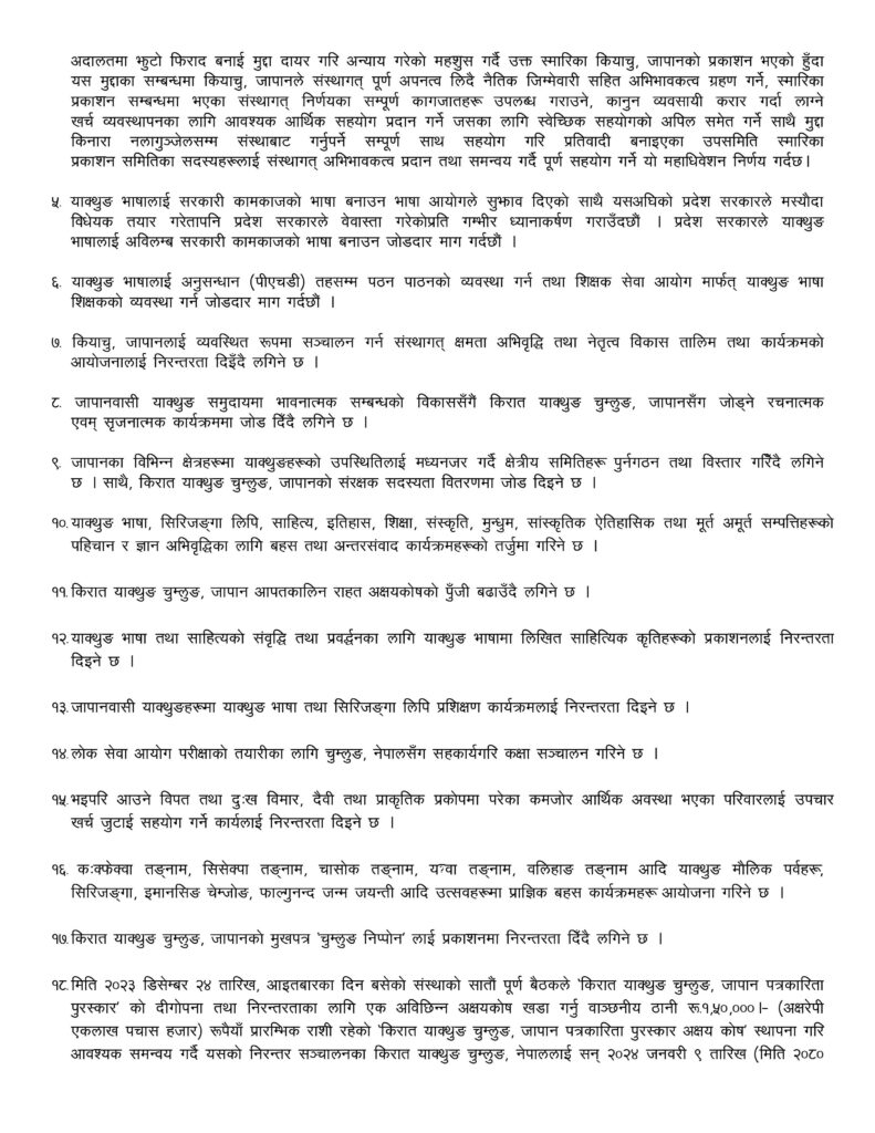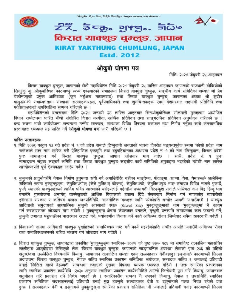 यसैवीच छैटौं महाधिवोशन उद्घाटन समारोहका प्रमुख अतिथि तथा कियाचु, सङ्घीय कार्य समितिका अध्यक्ष प्रेम येक्तेन, नेफिन, जापानका कार्यवाहक अध्यक्ष श्री गुरूङ, एनआरएनए, राष्ट्रिय परिषद जापानका उपाध्यक्ष शुभाष लामिछाने, थकाली सेवा समितिका अध्यक्ष बुद्धि गौचन, नेपाल मगर संघका अध्यक्ष रामहरी खपाङ्गी मगर लगायतबाट किरात याक्थुङ चुम्लुङ, जापानद्वारा प्रकाशित याक्थुङ ख़ेदा, लक्- १ विमोचन गर्नुका साथै महाधिबेशन बन्द सत्रमा गत जनवरी २८ तारिख आइतबार सिनओकुबोस्थित सोलमारी मुराहलमा आयोजित बिधान सम्मेलनमा पारित बिधान मस्यौदा आर्थिक प्रतिबेदन र सांगठानिक प्रतिबदेन अनुमोदन गर्नुका साथै भावी कार्ययोजना सम्बन्धमा २१ बुँदे प्रस्ताव पारित गर्दै ओकुबो घोषणापत्र समेत जारी गरिएको छ ।