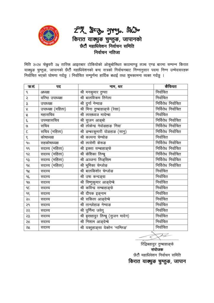 वरिष्ट उपाध्यक्षमा बालबिक्रम तिगेला, उपाध्यक्षमा रेखा तुम्बाहाम्फे र दुर्गा नेम्बाङ, महासचिवमा सिसाम मादेम्बा र उपमहासचिवमा सुजन आङ्बो, सचिवमा लोकेन नेयोङहाङ र सानु योङ्हाङ त्यस्तै कोषाध्यक्षमा कल्पना चेम्जोङ सहकोषाध्यक्षमा लासेमी केरूङ निर्वाचित भएकाछन् भने सदस्यहरूमा सुजन मादेन लिम्बू , बाल किशोर चेम्जोङ्,बिस्णु कुमार आङ्देम्बे,उषा कन्दङ्वा,केसिका लिम्बुखिम,निशाम आङ्देम्बे,कबिन्द्र सम्बाहाम्फे , दिपक इङनाम, अन्जना लिङखिम, पुर्णिमा जबेगु, इक्सा सम्बाहाम्फे, भुमिका चेम्जोङ्, शाकिला आङदेम्बे, तान्छोहाङ नेम्बाङ, नाम्लिङ येक्तेन निर्वाचित भएकाछन् ।
