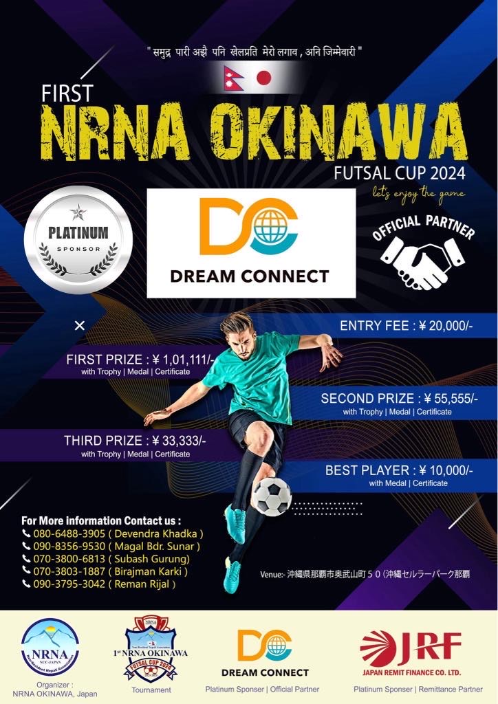 गैर आवसिय नेपाली संघ क्षेत्रिय समिति ओकिनावाले जापानको ओकिनावा क्षेत्रमा खेलप्रति मेरो लगाव र जिम्मेवारी भन्ने मुल नाराका साथ प्रथम नेपालि फुट्सल प्रतियोगिता सम्पन्नगरेको छ ।