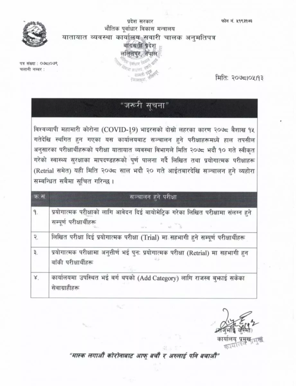 विभागका निर्देशक लोकनाथ भुसाालका अनुसार अब यातायात व्यवस्था कार्यालयहरूले कम्तीमा सात दिनको समया राखेर सूचना प्रकाशन गरी परीक्षा सञ्चालन गर्नेछन् ।
